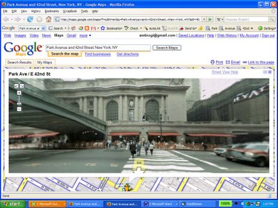 Now comes Google Maps to the rescue. It has added a similar feature, called Street View. The screen capture accompanying this post shows the Street View image of Grand Central Station in Manhattan. Blue outlines on maps show locations where it is available. Drag an icon to a point on the map, and the image pops up showing the street view of that address. You can rotate the image 360 degrees and click arrow buttons to move up or down a street. I have not found a listing of the cities it includes, but I can see from checking that it includes New York, San Francisco, Las Vegas and Miami.