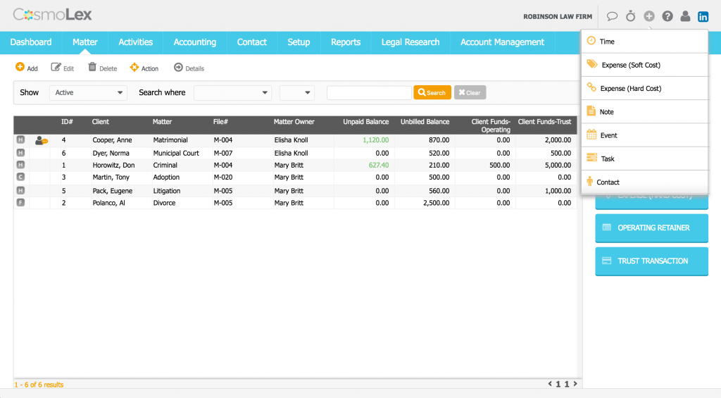New matter dashboard. When you go to a matter within CosmoLex, you now come to a new matter dashboard that displays key details and data at a glance.