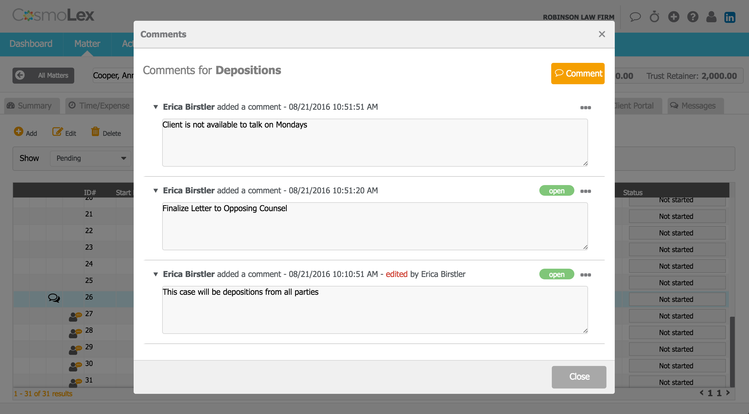 If a user adds a comment that requires action from someone else in the firm (or follow-up by the user), the user can mark it as “Open” and notify the other person. Once the person completes the action, it can be marked as “Closed.”