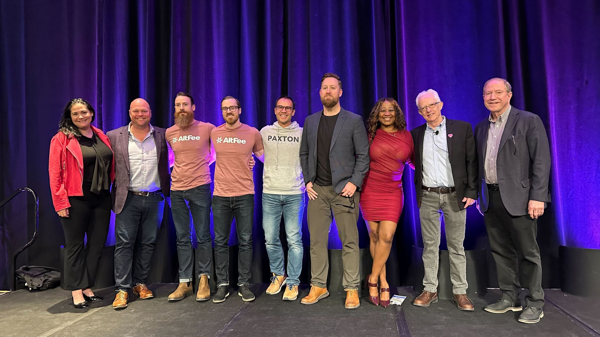 Pictured above: Techshow cochair Sofia Lingos, Clio CEO Jack Newton, AltFee cofounders Digby Leigh and Scott Leigh, Paxton AI cofounder and CEO Tanguy Chau, Skribe.ai founder Karl Seelbach, Techshow cochair Cynthia Thomas, me, and ABA President-elect Bill Bay.