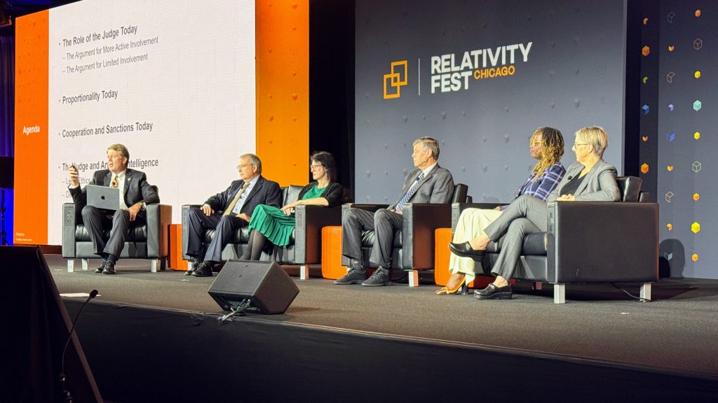 An annual highlight of Relativity Fest is the judge’s panel moderated by David Horrigan. This year’s panel featured (from left) Horrigan; U.S. District Judge Xavier Rodriguez, W.D. Texas; Dr. Victoria McCloud, former judge, High Court of Justice, U.K.; U.S. Chief Magistrate Judge William Matthewman, S.D. Fla.; Justice Tanya R. Kennedy, associate justice, appellate division, First Department, New York; and U.S. Magistrate Judge Allison Goddard, S.D. Calif.