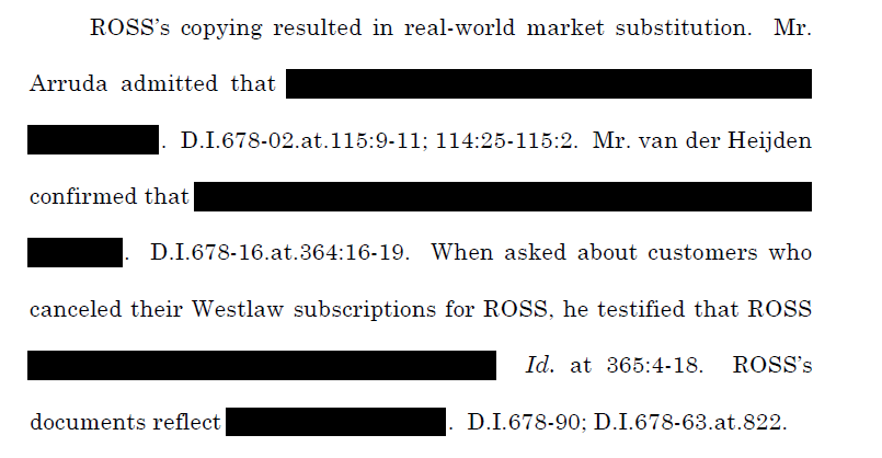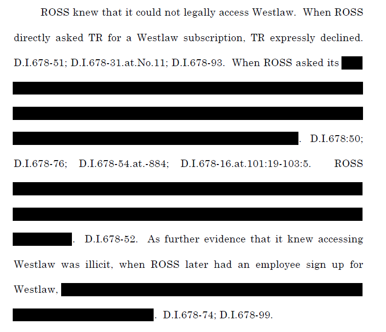 OK, some key details left out here. “When ROSS asked its” … its what — and to do what? The context seems to suggest that after TR turned down ROSS’s request for a Westlaw subscription, ROSS turned to someone else. Of course, we know eventually that “someone else” was LegalEase, but what about in the interim.