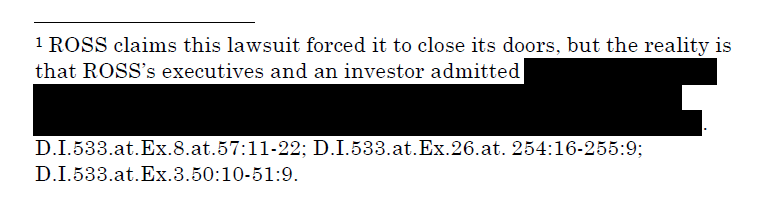 But the redacted footnote you see here suggests ROSS’s own executives admitted something that would tell a different story — that it was not the lawsuit that forced it to close its doors, but some other “reality.”