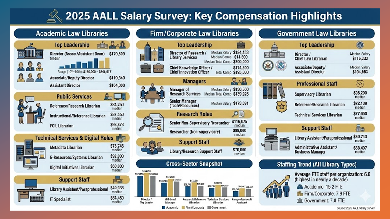 The report, which surveyed 257 organizations across academic, firm/corporate and government law libraries, provides what AALL describes as the most detailed compensation benchmarks available for legal information professionals. The survey achieved a 45% response rate.