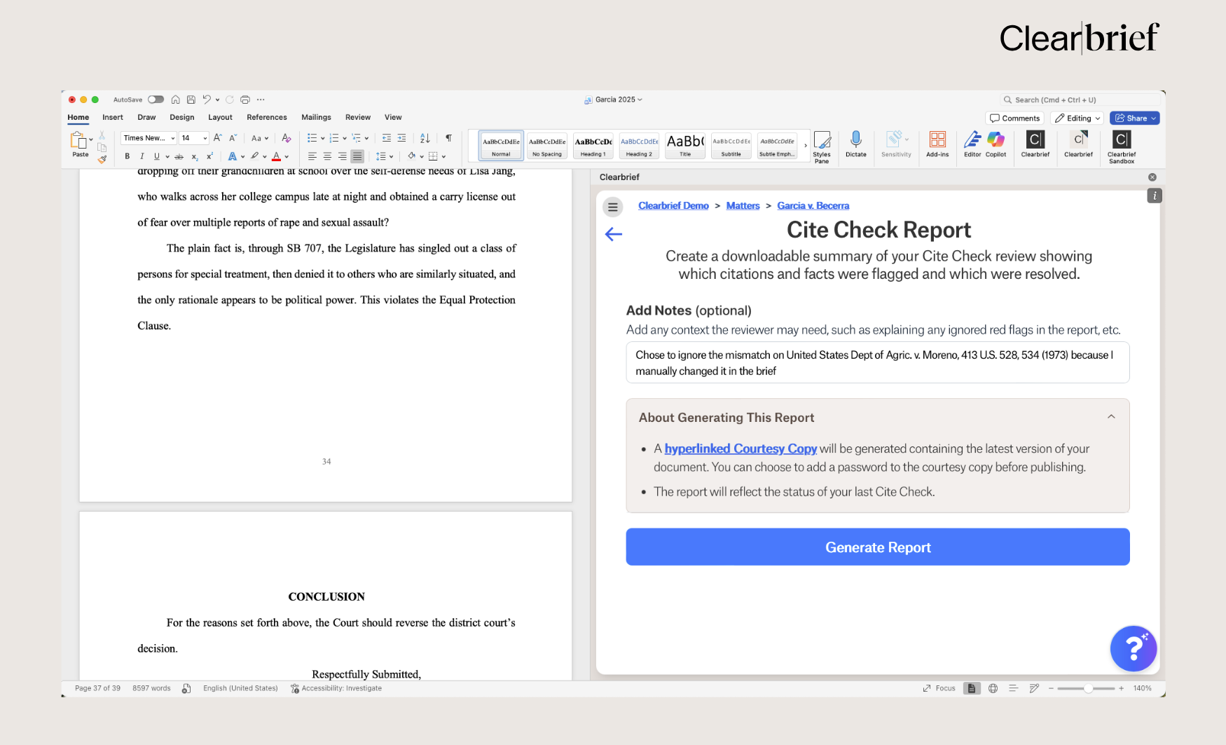 When a user finishes reviewing a document, generating the Cite Check Report is straightforward. The report allows the reviewer to add notes explaining their review process, such as why they may have ignored certain red flags.