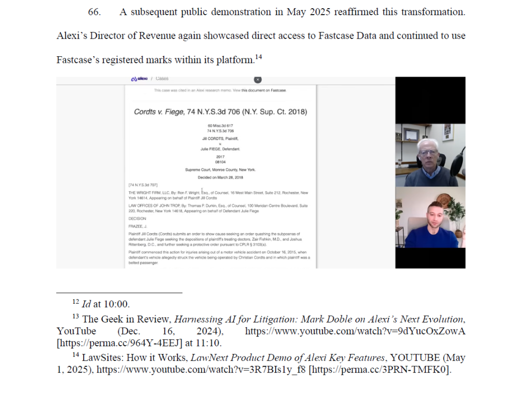 The complaint cites public statements by Alexi’s CEO Doble, including a March 2024 LinkedIn post in which he described Alexi as “increasingly a legitimate alternative to incumbent legal research providers.”