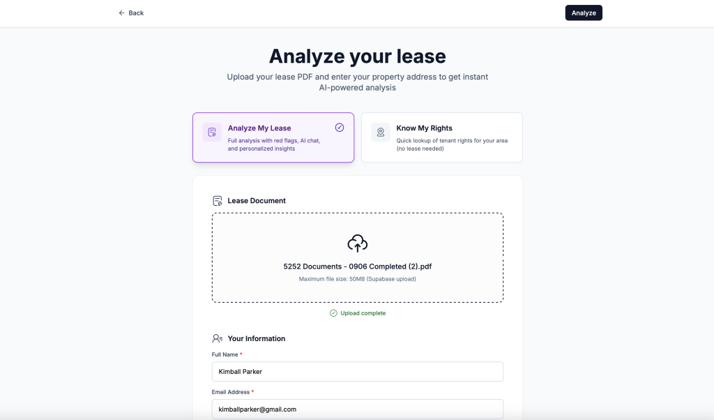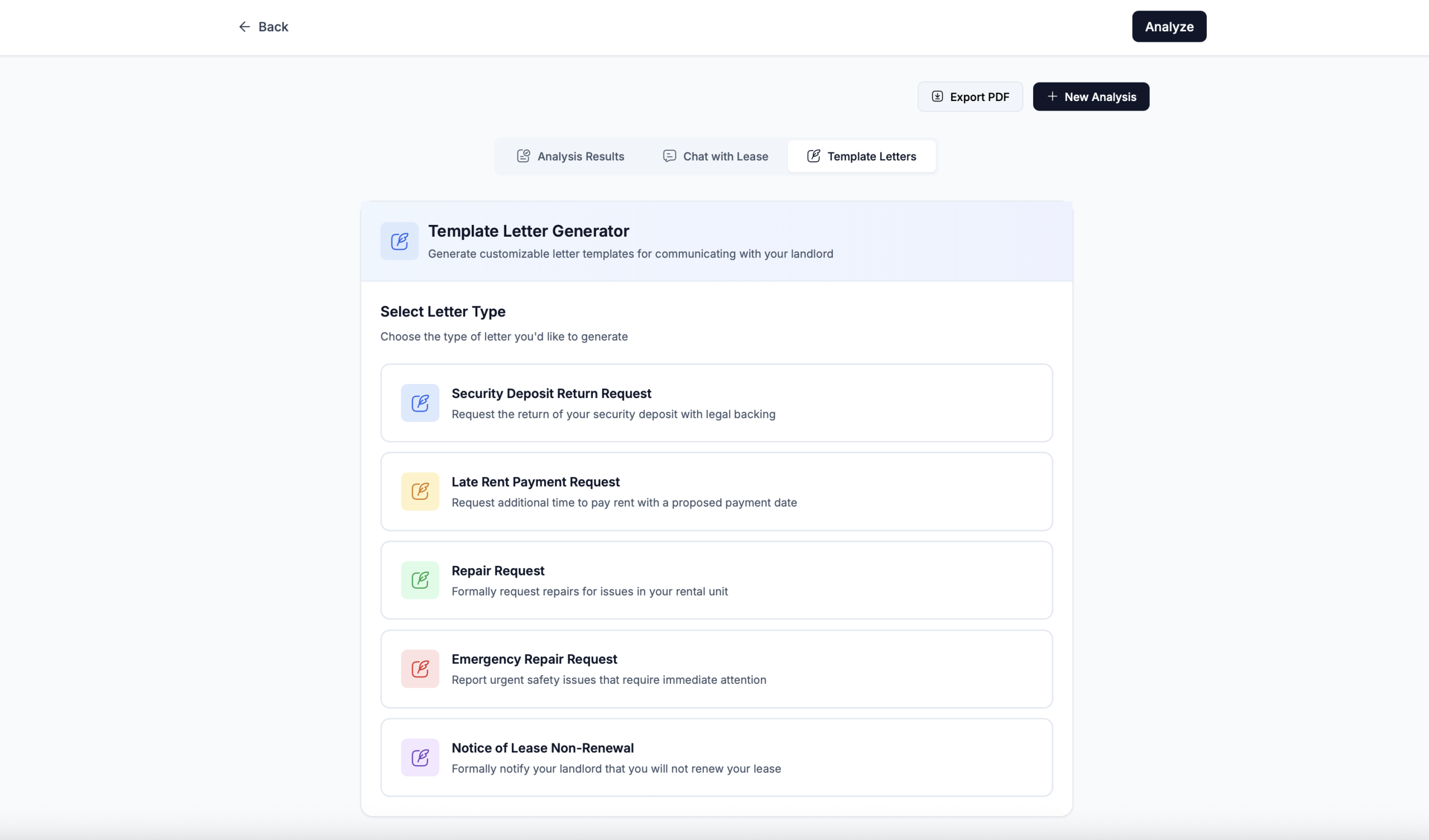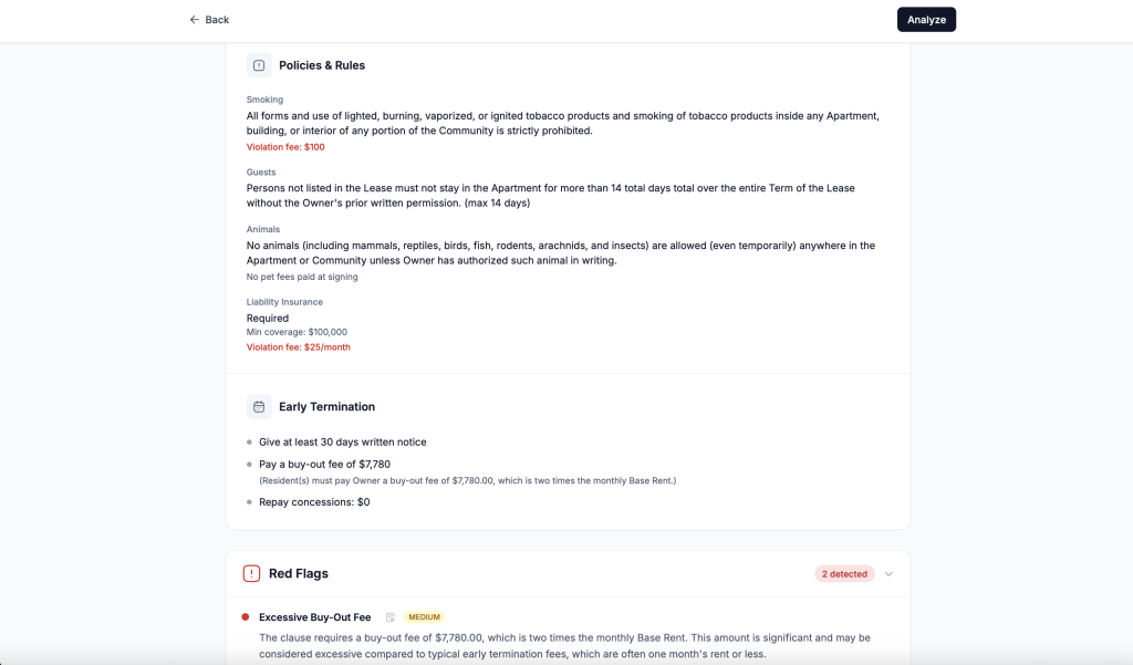 - Lease Analyzer: Renters can upload their lease and receive an AI-powered analysis that identifies any red flags. For example, the system will flag unusually high security deposits or problematic clauses.