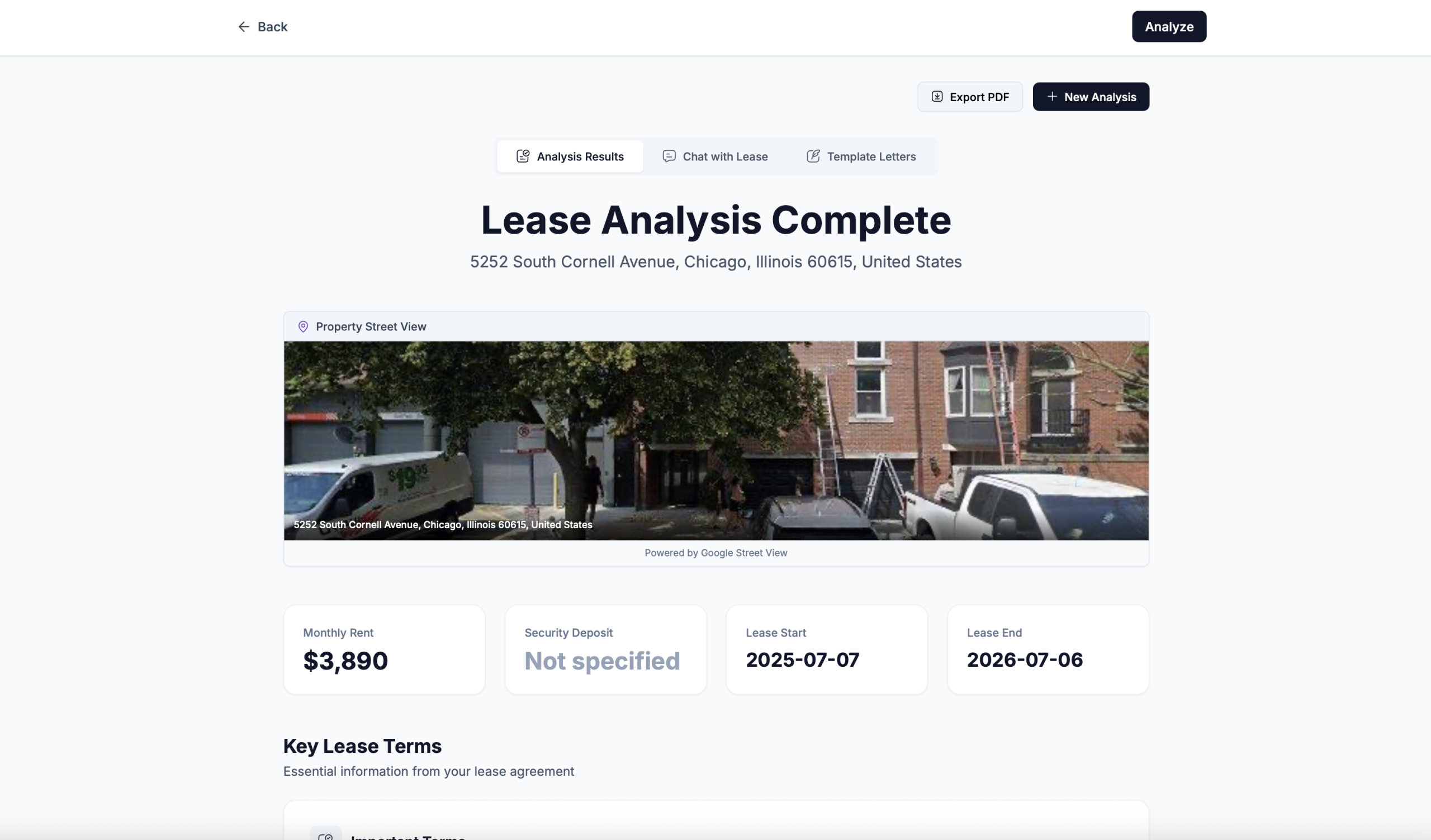 The tool also provides street view images of the rental property, plain-English explanations of legal jargon, and highlights key dates like move-in dates. Users can export the entire analysis as a PDF to save, share with an attorney or keep for future reference.
