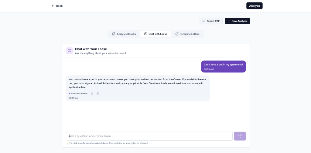 - Lease Chat: Users can ask questions about their lease in plain language and receive answers with direct citations to specific lease provisions, complete with page references.
