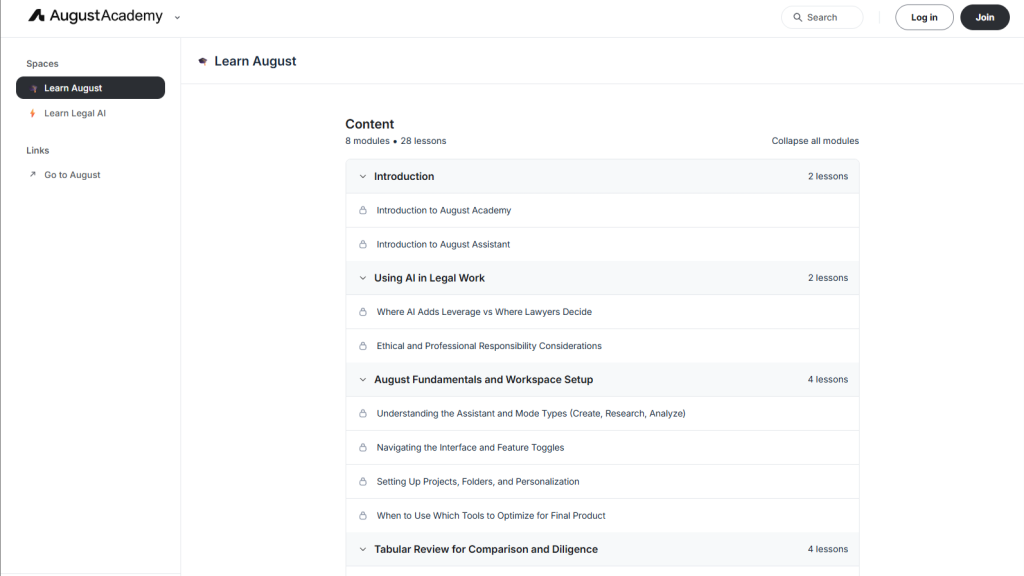 Alongside the self-service platform, August is launching August Academy, a comprehensive library of video tutorials and practical lessons covering everything from document review strategies to advanced research techniques. The educational content is available for free — users do not even need to be August customers to access the videos.