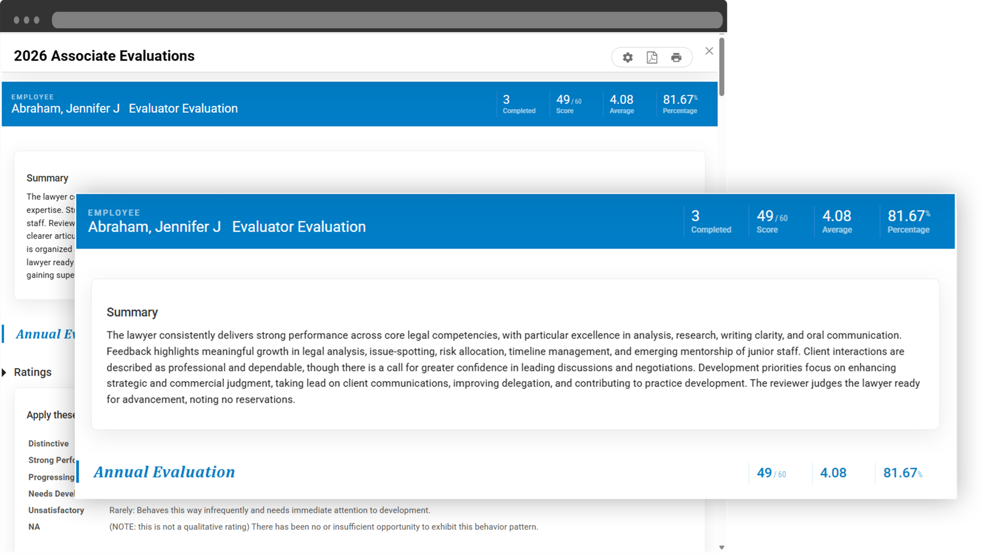 An auto-summarization feature gives firm leaders access to concise summaries of individual or aggregated evaluations, generated automatically as part of the evaluation process. This is aimed at reducing the time required to interpret feedback during high-volume review periods, Aderant said.