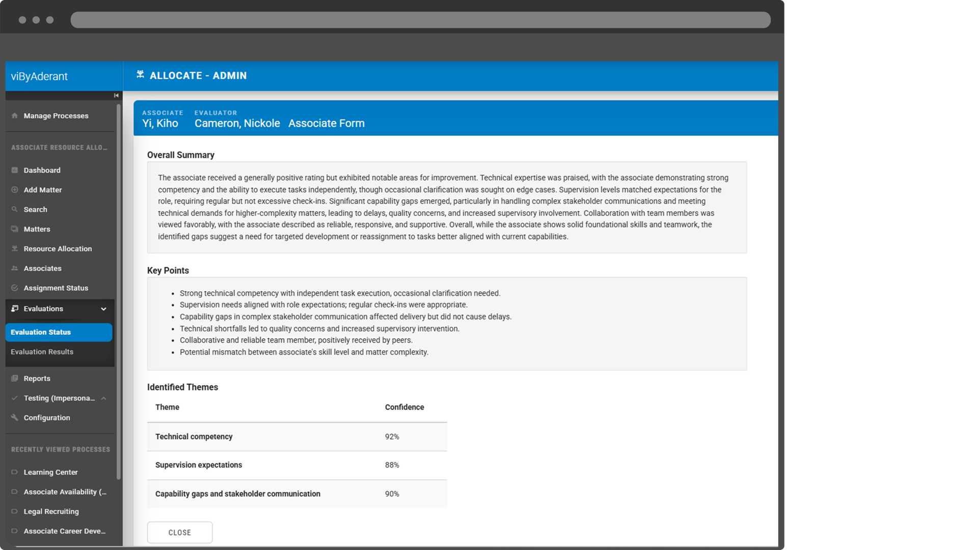 In addition, viAllocate now includes matter-based evaluation workflows that capture performance feedback tied to specific matters or projects. This feedback is then made available for staffing considerations, giving firms greater visibility into demonstrated experience without adding administrative steps.