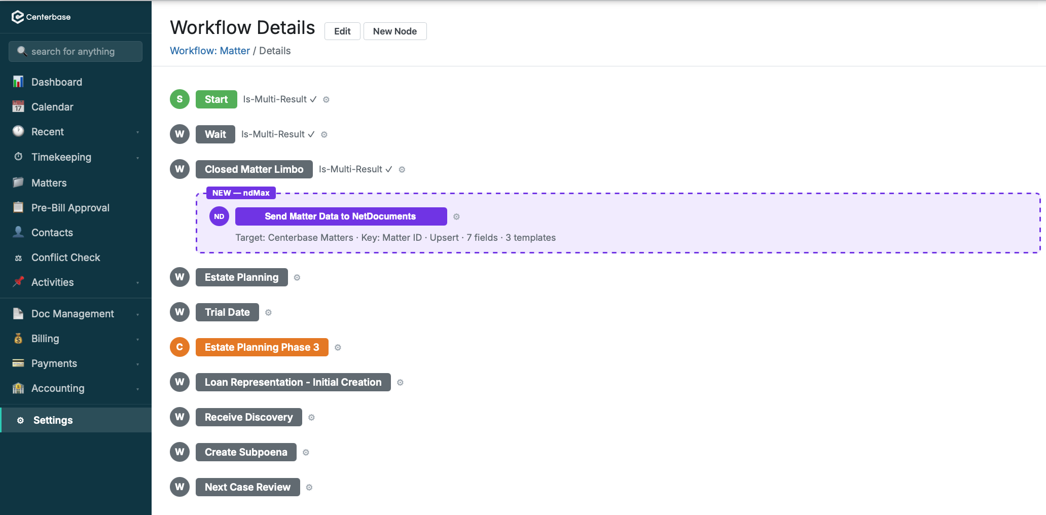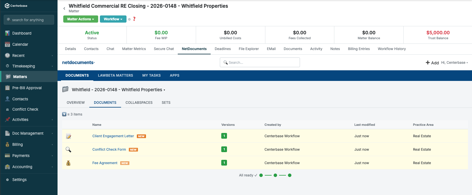 In practical terms, when a new matter is created in Centerbase, the system can automatically trigger NetDocuments to create document packages, workspaces and templates based on the matter type. For a real estate closing, for example, engagement letters, workspace folders and review tasks could be generated automatically before the first client call.