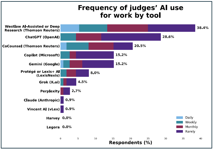 Other AI tools showed minimal adoption. Anthropic’s Claude was used by only 0.9% of judges, all at a frequency of “rarely.” Harvey and Legora showed 0% usage across all responding judges. Vincent AI (vLex) similarly showed only 0.9% rare usage.