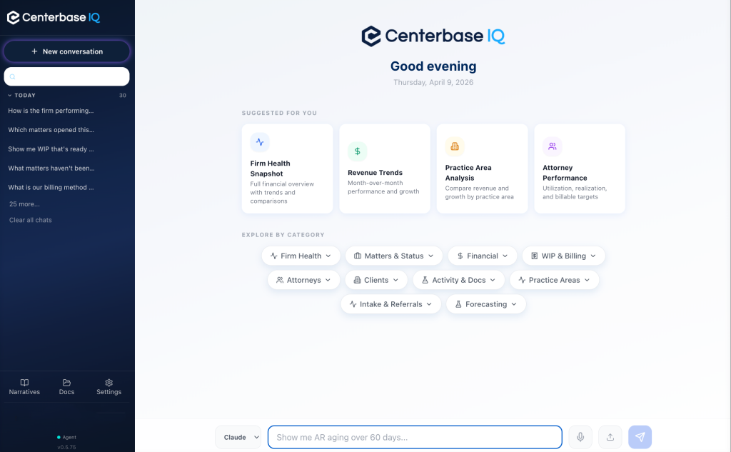 Today, the company is announcing the limited release of Centerbase IQ, an AI-powered natural language chat tool embedded directly within the Centerbase platform that enables managing partners and firm administrators to ask questions about firm performance in plain language and get quick, visual, citation-backed answers drawn from the billing, financial, matter, and productivity data already housed in Centerbase.