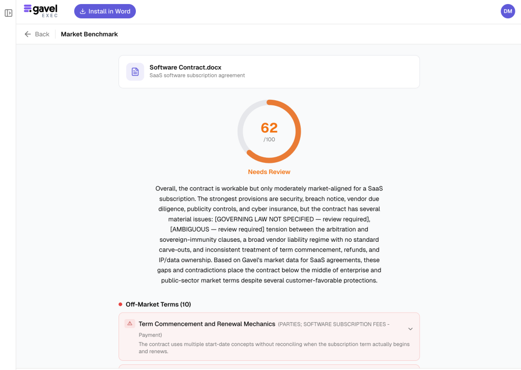 - Market benchmarking of clauses or full documents against standards Gavel has built into the product across corporate transactional and commercial categories, with segmentation by industry and company size.